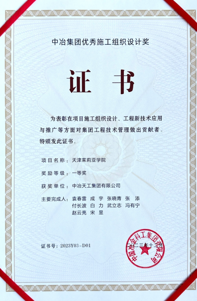 中冶集团优秀施工组织设计奖一等奖天津茱莉亚学院