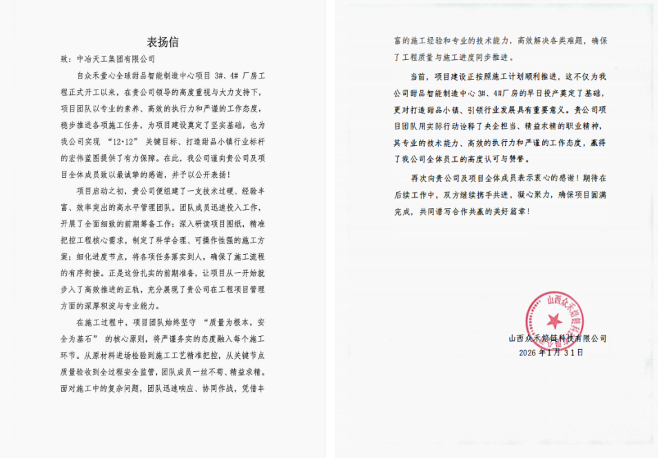1月31日,中原公司承建的眾禾壹心全球甜品智能制造中心項(xiàng)目收到業(yè)主表?yè)P(yáng)信。信中對(duì)中冶天工各項(xiàng)工作的穩(wěn)步推進(jìn)和項(xiàng)目團(tuán)隊(duì)專(zhuān)業(yè)高效的施工管理與精益求精的建造態(tài)度給予了高度評(píng)價(jià)與充分贊揚(yáng)。