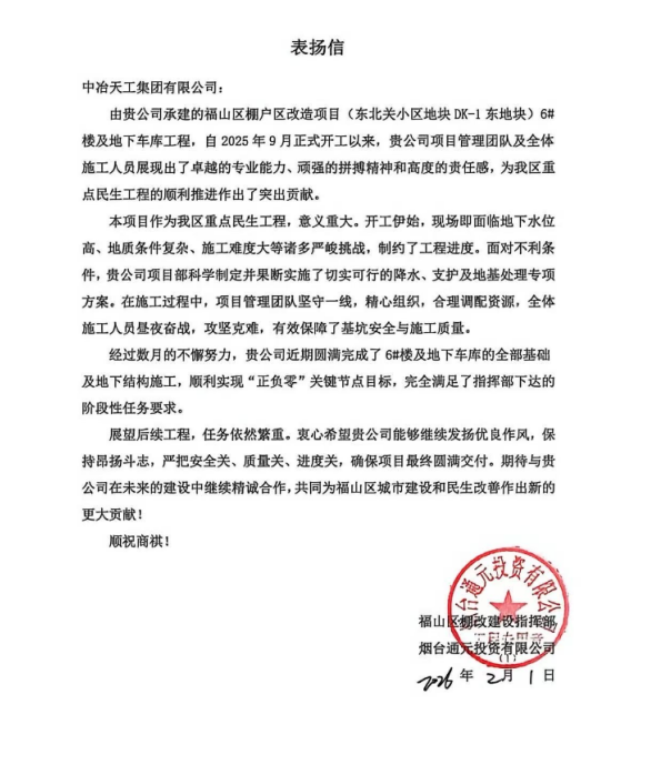 表揚信中,對項目管理團隊的專業(yè)能力、拼搏精神與責(zé)任擔(dān)當(dāng)給予高度肯定,希望后續(xù)工程,能夠繼續(xù)發(fā)揚優(yōu)良作風(fēng),嚴(yán)把安全、質(zhì)量、進度關(guān),確保項目最終圓滿交付,為福山區(qū)城市建設(shè)和民生改善貢獻力量。