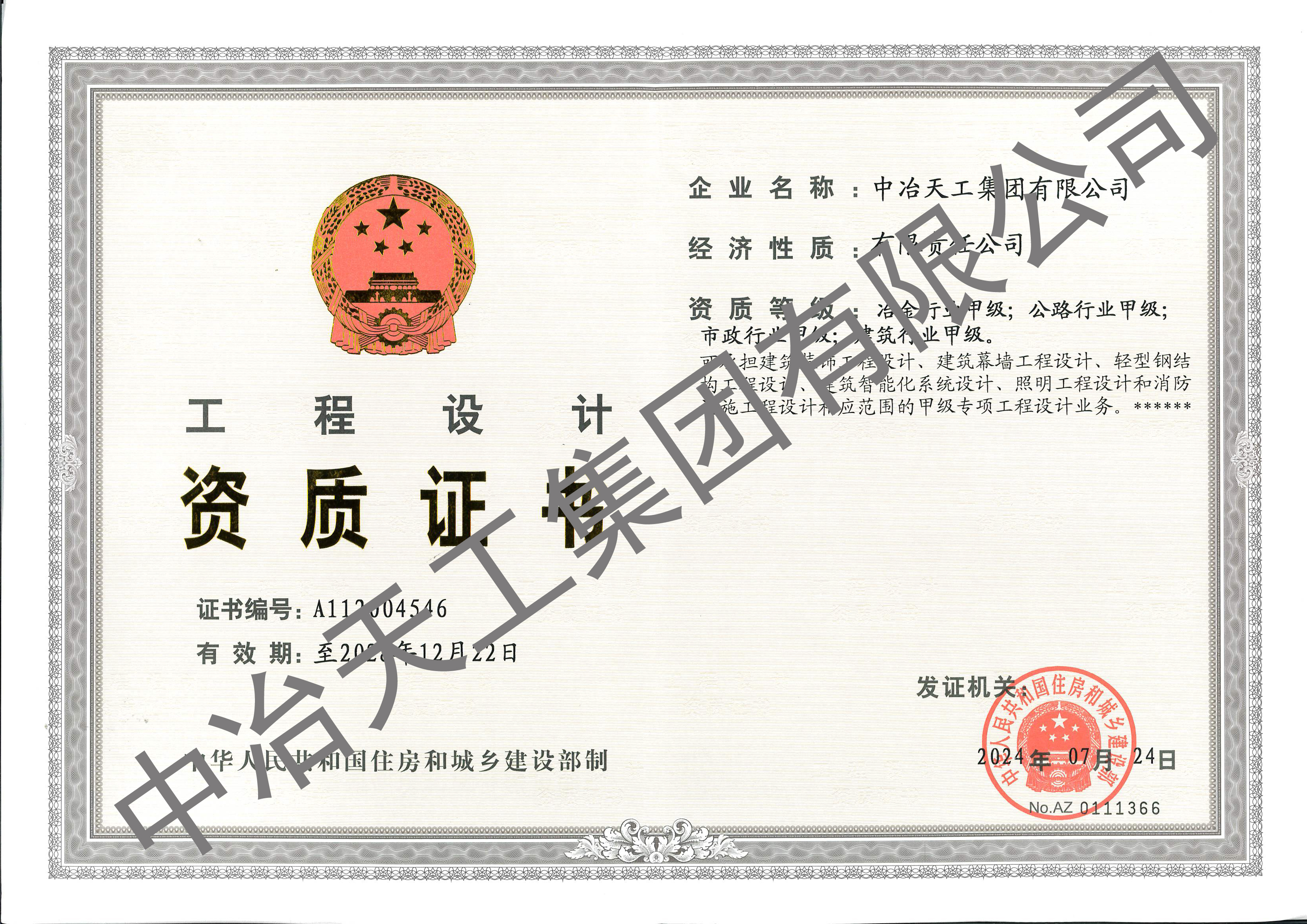 工程设计资质证书-冶金、公路、市政、建筑行业甲级